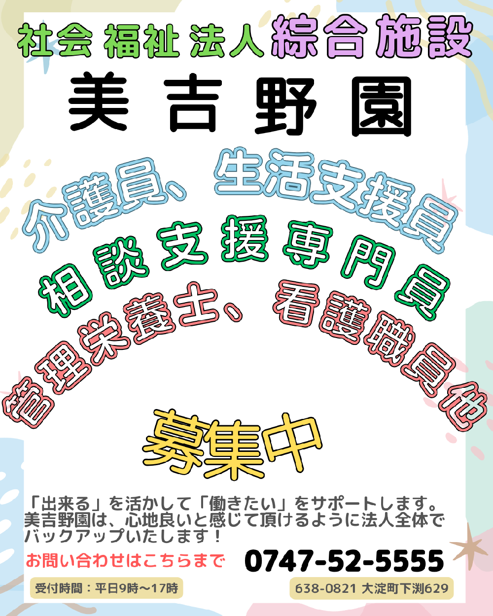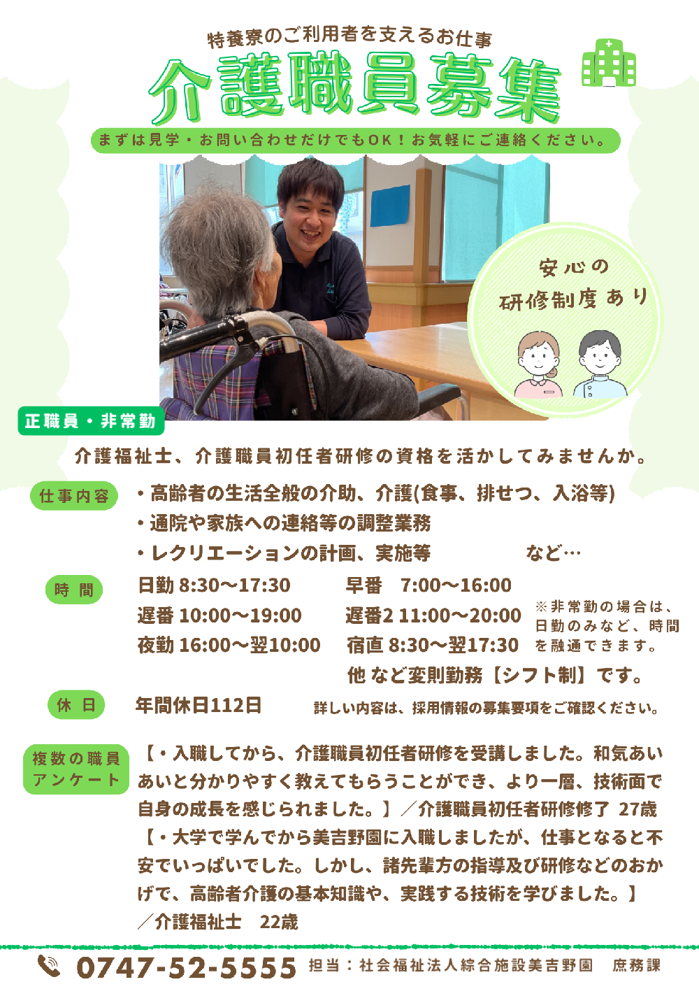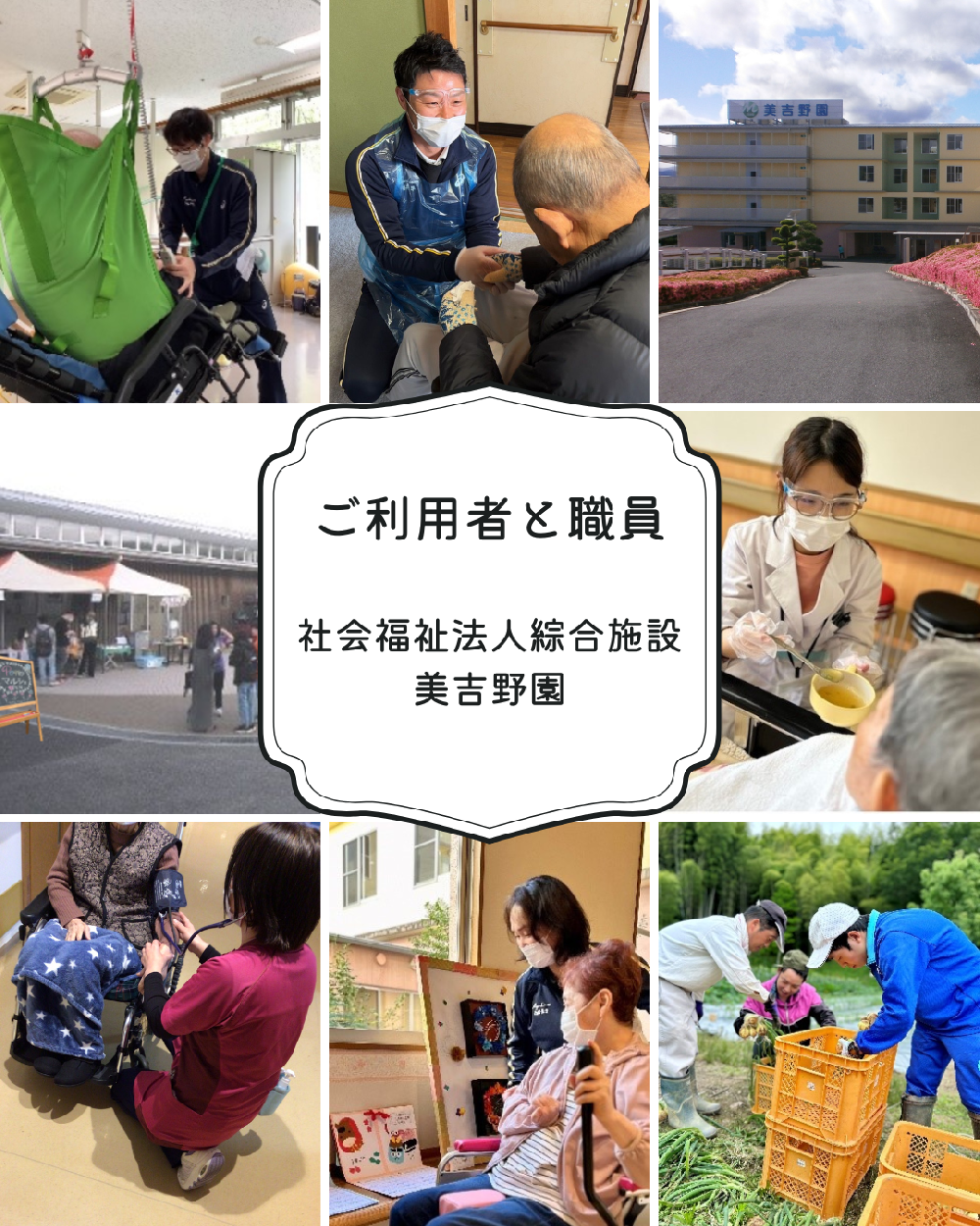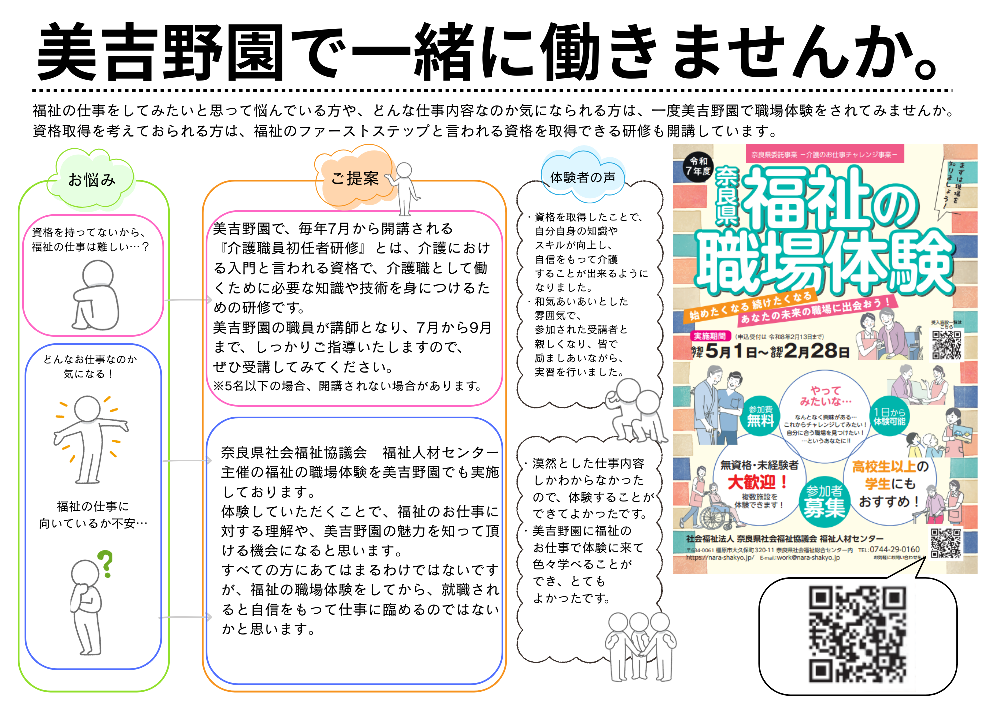 社会福祉法人綜合施設 美吉野園では、新卒採用及び中途採用にて、介護職員・看護師・理学療法士等の職員を募集しております。詳しい募集要項をご覧の上エントリーフォームからご応募ください。ご利用者の幸せを支える仕事です。元気があり意欲とやりがいを持った積極的な方のご応募をお待ちしております。
