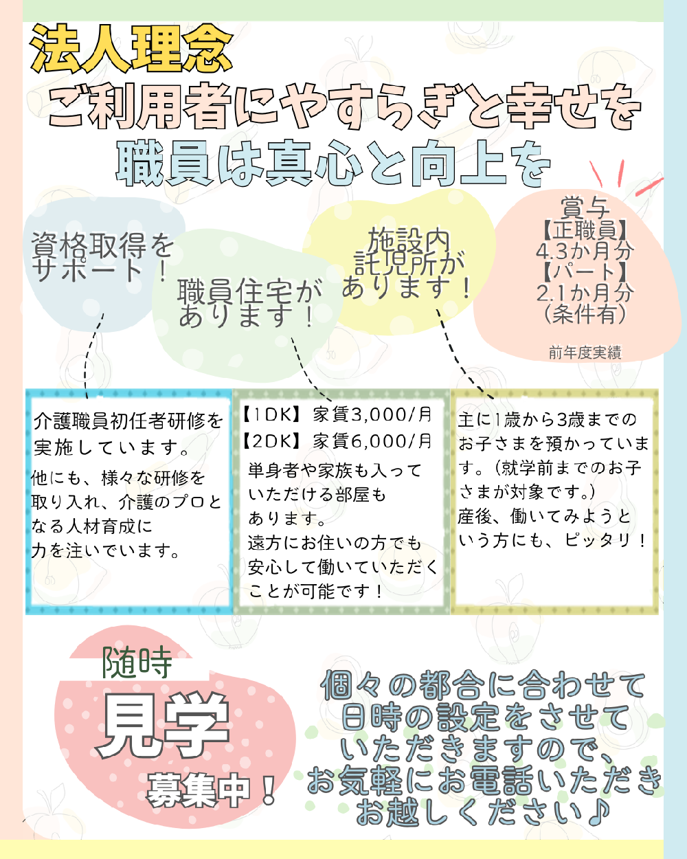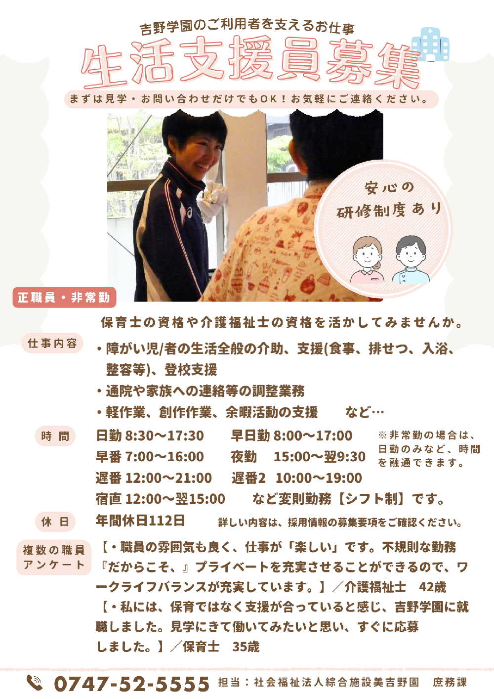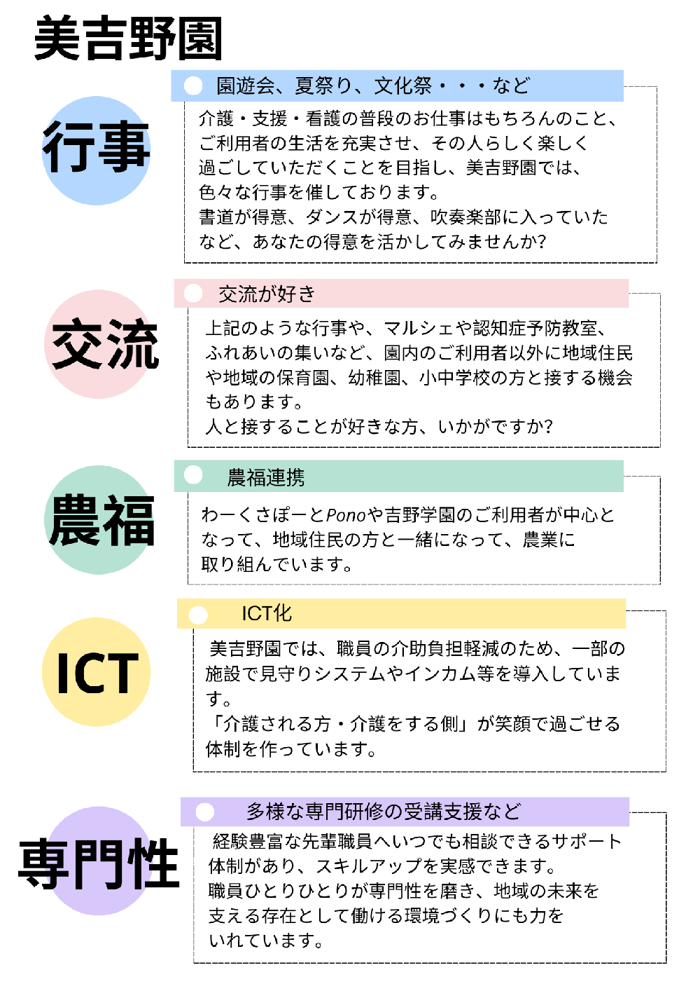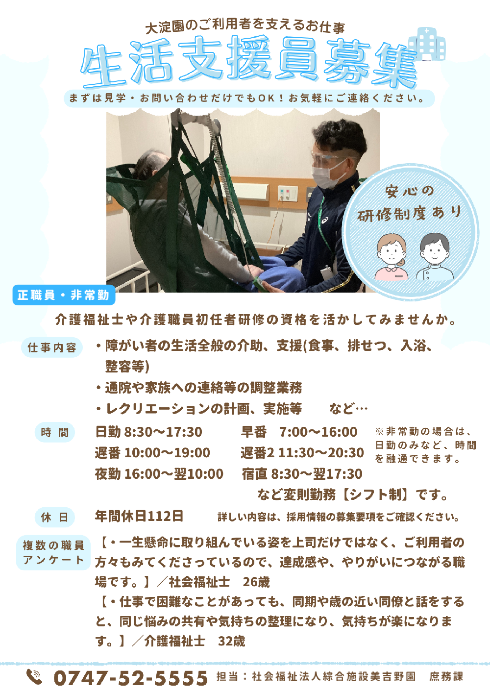 社会福祉法人綜合施設 美吉野園では、新卒採用及び中途採用にて、介護職員・看護師・理学療法士等の職員を募集しております。詳しい募集要項をご覧の上エントリーフォームからご応募ください。ご利用者の幸せを支える仕事です。元気があり意欲とやりがいを持った積極的な方のご応募をお待ちしております。